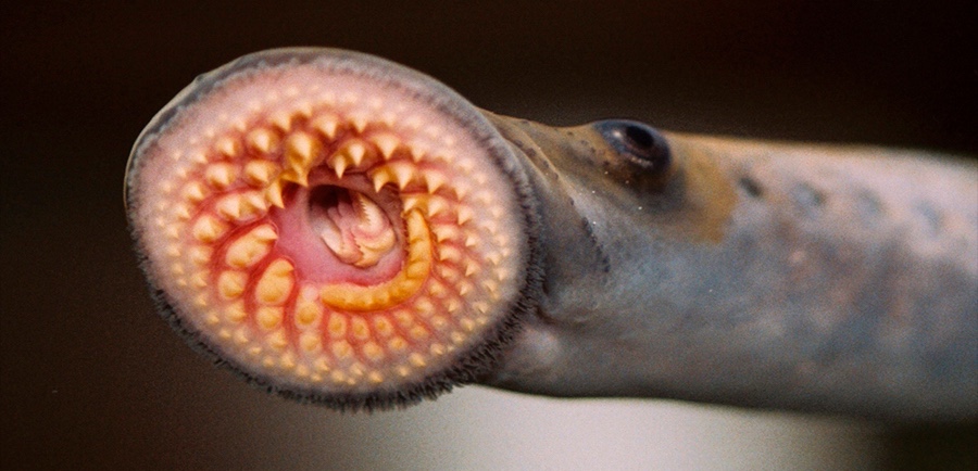La boca de las lampreas es circular y está llena de ventosas, con la cual se adhiere a las especies que parasita, como tiburones y mamíferos marinos. Dentro de la boca, presentan dientes cónicos y una lengua adaptada para raspar los tejidos, estas estructuras le permiten realizar una herida en la piel de sus presas y succionar la sangre que constituye su alimento.